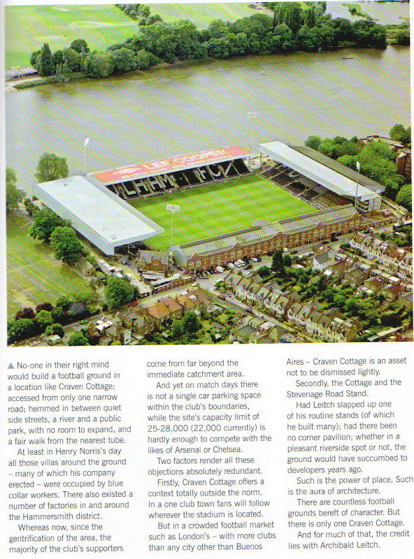 Craven Cottage is always beautiful, the best location for a football ground after Villa Park.The stadium reveals clearly the imprint of Archibald Leitch the architect of VP. Both the stadia are at the edge of a park (Aston Park and Bishop Park respectively).The beautiful red bricks façade of Stevenage road has something in common with the elegant old Trinity Road façade.