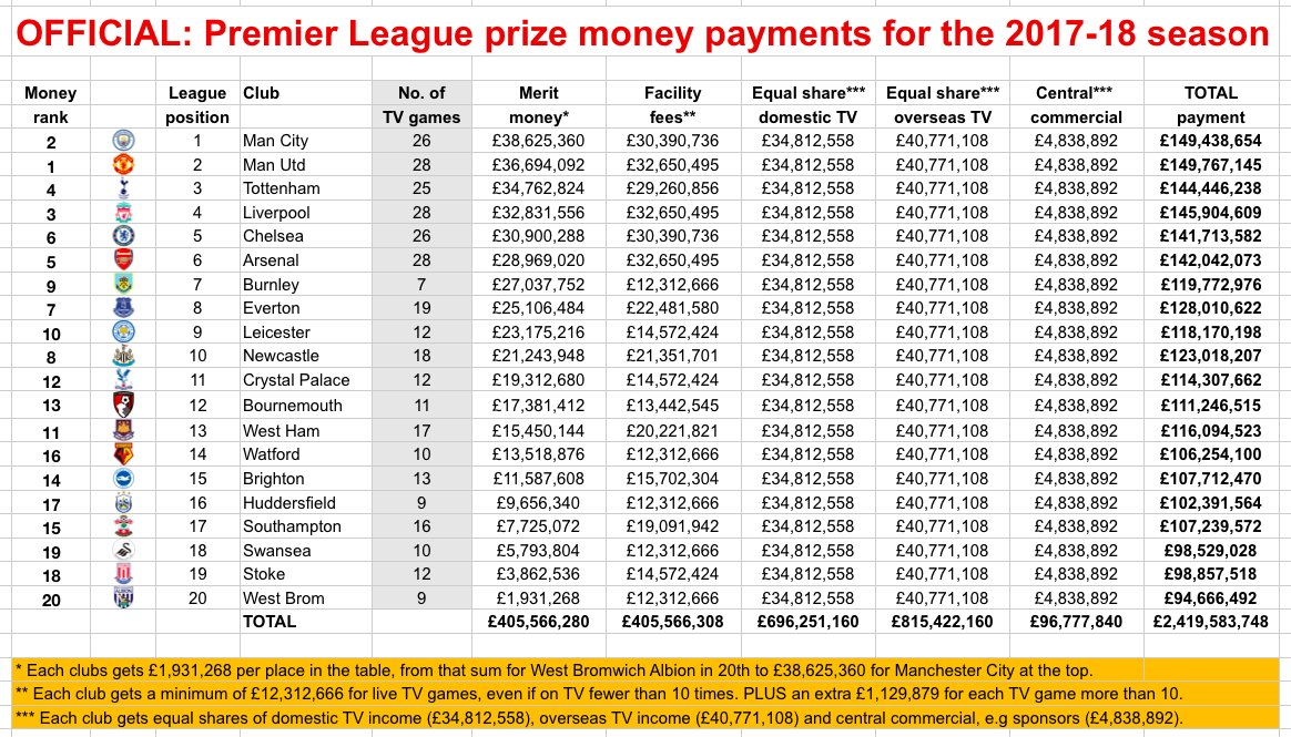 The side that finishes top should get a lot more than the side that finishes bottom imo. Crazy to think that when you add in parachute payments, sponsorship and all the extra money commercial money that comes from being a PL side, that even 1 season in the top flight must be worth at least an extra £150m to a club.