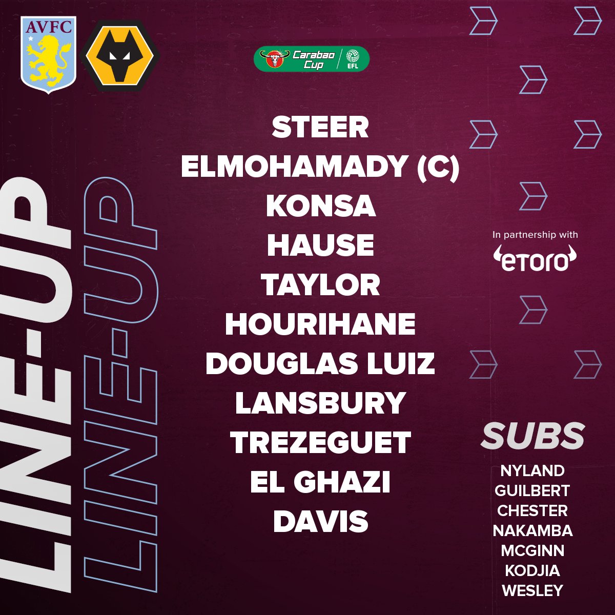 Unfortunately, Tuesday had dropped down the list of priorities due to performances over the last couple of weeks.  The main priority should now be making sure key players are fit and ready for the three league games coming up over the next couple of weeks.  They have now become the priority.  That said, a team of Nyland, Elmo, Chester, Konsa, Taylor, Luiz, Hourihane, Lansbury, Trezeguet,  El Ghazi and Kodjia should still be strong enough to get past the kind of team Liverpool are likely to put out.