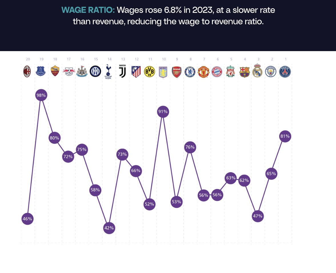 🚨UEFA's 2024 Financial Landscape report is out and more or less confirms that Villa will fail UEFA Squad Cost test (possibly sustainability too). Chelsea also appear to fail. Newcastle very close but not in Europe this season. PSG and Roma in settlement regimes so not sure how those are impacted/dealt with.NB: this is the raw Wage:Turnover ratio but directionally indicative of SCR. No major shocks but also shows UEFA's appraisal of revenue - meaningful differences with Chelsea (€25m lower vs Deloitte (€545m)).