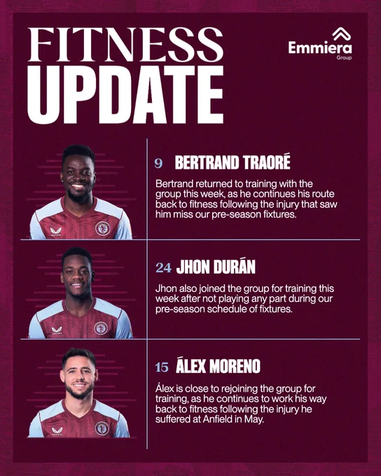 Jacob Ramsey is still "some weeks away" from a return to training, while Emi Buendía and Tyrone Mings are long-term absentees.